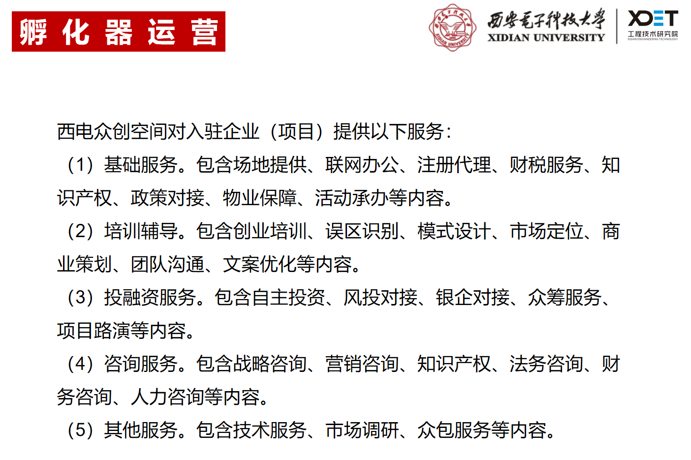 业务范围:众创空间、孵化器、国家大学科技园主体运营,校内外产学研活动对接、执行,包括但不限于校地共建、校企合作、创新创业大赛、投融资服务等。